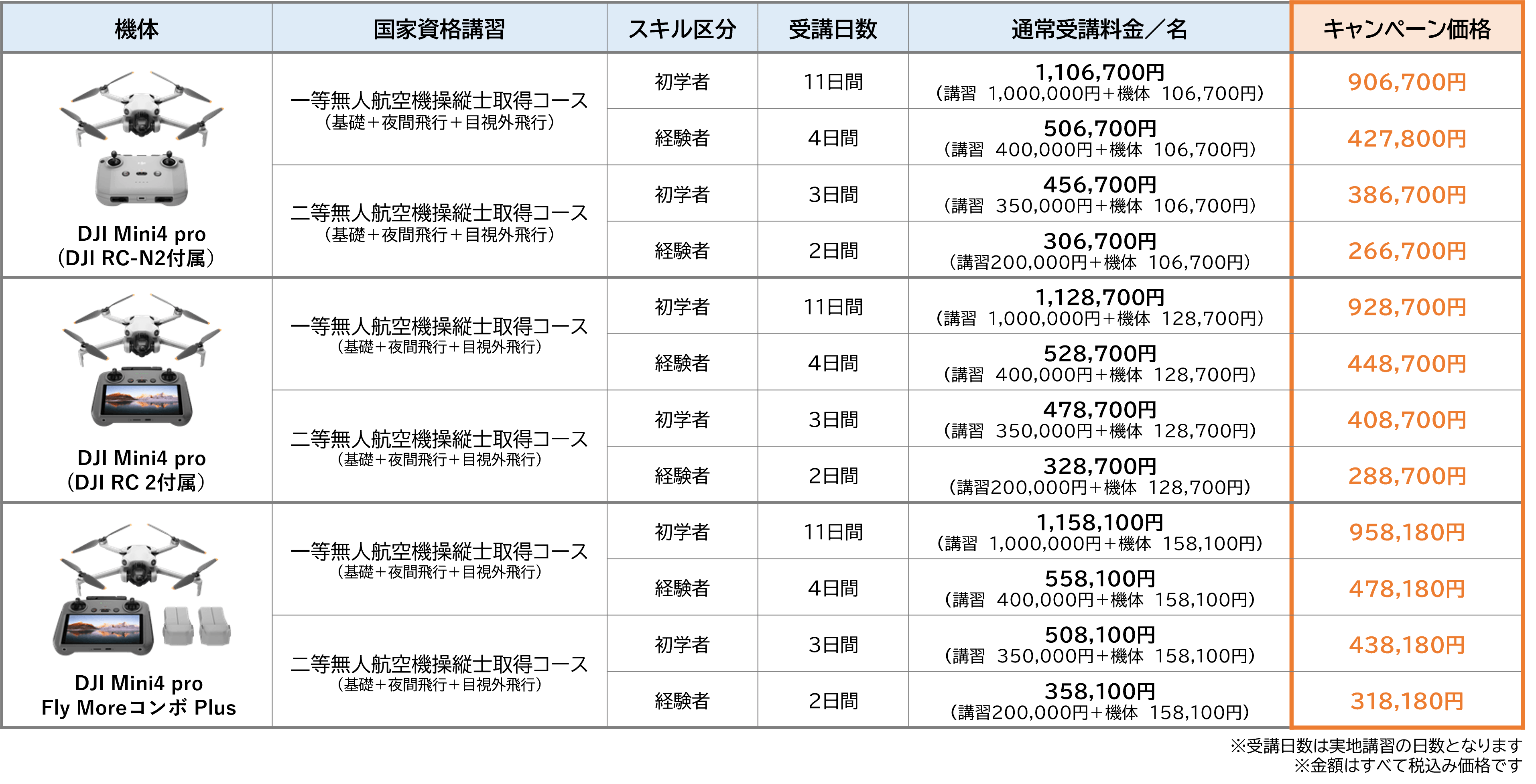 国家資格取得講習と機体を、お得なセット価格でご提供します。