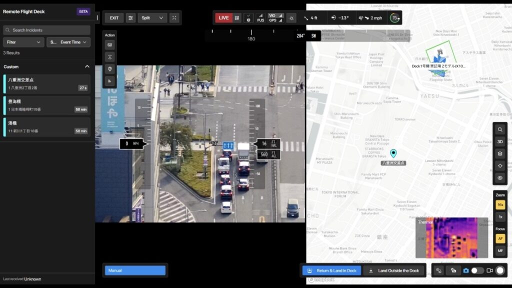| 成果 | ・迅速な被災状況把握 屋上に設置されたSkydio Dock for X10を利用することで、遠隔からの飛行指示・自動撮影により、建物・道路・人流の状況を上空から広範囲に把握可能であることを確認 ・通信環境の確保 地上通信網の途絶が想定される状況下でも、衛星通信「Starlink Business」により、安定した映像伝送が可能であることを確認 |