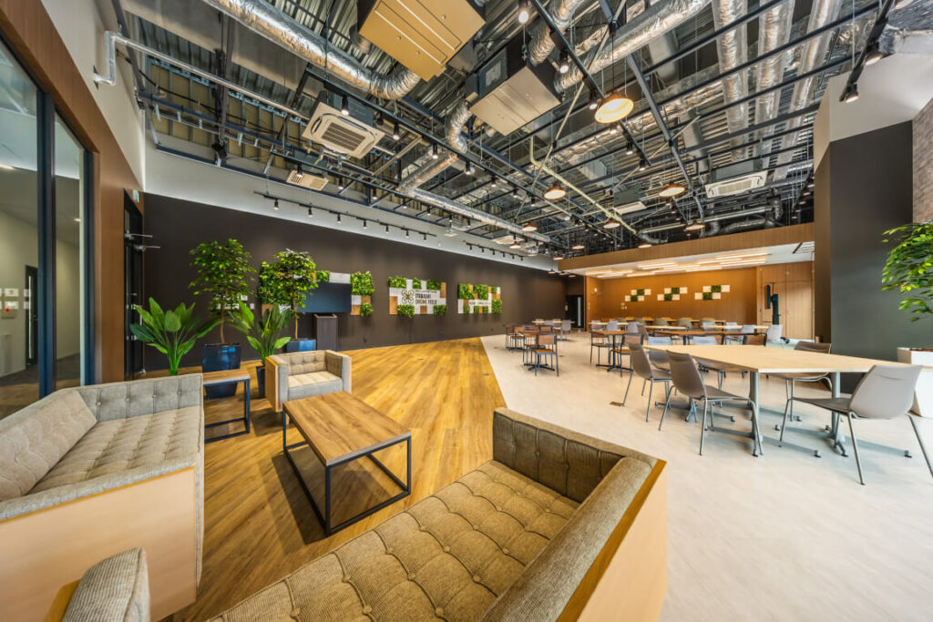 KDDIスマートドローンアカデミー東京板橋校は、都営三田線西台駅から徒歩10分で、東京都23区内に位置しながらも広大な敷地を活かした都内最大級のドローンフィールドである、板橋ドローンフィールドにあります。ドローン飛行用のネットフィールドでの講習に加え、橋梁や外壁、太陽光パネル、屋内のピット点検といった実践的な講習を、実際に稼働中の施設を用いて受講いただくことができます。併設されているラウンジは、交流・共創の場として利用可能です。