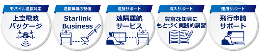 Skydio Dock for X10の機能を最大限に活用いただくため、KDDIスマートドローンは、上空電波(4G LTE)によるドローンの安定的な遠隔運用を実現する「上空電波パッケージ」、通信の確保が困難な地域で高速通信を可能とする衛星通信ブロードバンド「Starlink Business」、専門オペレーターが日々の運航を代行する「遠隔運航サービス」、豊富な運航実績にもとづく「実践的講習」、運航に必要となる申請をサポートする「飛行申請サポート」を提供し、お客様のSkydio Dock for X10の導入から運用までをフルサポートします。