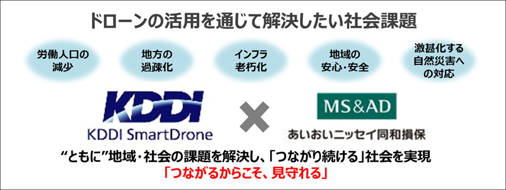 KDDIスマートドローン株式会社(本社:東京都千代田区、代表取締役社長:博野 雅文、以下、「KSD」)とMS&ADインシュアランスグループのあいおいニッセイ同和損害保険株式会社(本社:東京都渋谷区、代表取締役社長:新納 啓介、以下、「あいおいニッセイ同和損保」)は、ドローンの普及促進とその活用による社会課題の解決を目指し、5月28日に業務提携に関する覚書(以下、「MOU」)を締結し協業を開始しましたので、お知らせいたします。