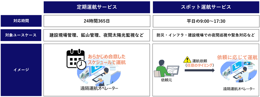 今回のサービス拡充により、事前に設定したスケジュールで定期飛行を行う24時間365日対応の「定期運航サービス」と、災害発生時など突発的な活用ニーズにお応えする「スポット運航サービス」を提供します。