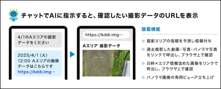 MODEの現場特化型AIアプリケーション「BizStack」との連携により、ドローンで撮影した画像・映像データを検索性の高いデータベースとして構築・蓄積し、遠隔から誰もが瞬時にデータを取得・活用できる環境を実現します。データは自動で撮影エリア・日時ごとにBizStackと連携したKDDIスマートドローンのデータベースに格納され、チャット形式で簡単に呼び出し可能です。現場に行くことなく、遠隔からPCやスマートフォンなどのデバイスから即時確認でき、ドローン飛行開始時にはリアルタイム映像の確認も可能です。